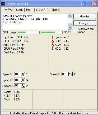 About testing... This could be a problem because if you crash then SpeedFan will shut down so you will have to try and time it   :-\ , not sure how you could, but you did have a time limit above.